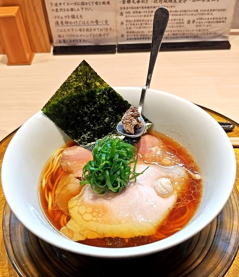 ポルチーニ醤油らぁ麺1800円2025年9月5日16時25分並び無しやや久しぶり。3月27日以来。鬼滅の刃を見た後、奥さんと。凄い映像だった。3人体制。作り···